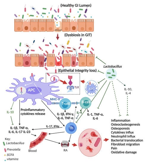 Microbes that encourage the development of other microorganisms were first designated as probiotics [66,67]. They’ve been more accurately characterized in recent years as mono- or mixed-cultures of live microorganisms that are advantageous to the host, increasing the qualities of the native microflora, whether supplied to an animal or a person. Probiotics are defined as food as preparations or nutritional supplements that promote human and animal health [66,67]. Their job is to get the human microflora back to its normal form after disruption due to poor diet, sickness, or the process of healing. The primary goal of ingestion, whether as food or as a medicine, is to improve the microbiota of the colon [68]. Probiotics are available in the form of capsules, pills, and tablets, as well as fermented foods [69]. To be evaluated for human usage, a probiotic strain must be isolated from human microflora, which gives it a high potential for adhesion to normal gastrointestinal cell walls. The variant should be safe for the host and not represent a hazard. Lactobacillus, Pediococcus, Bifidobacterium, Lactococcus, Streptococcus, and Leuconostoc are the probiotic bacteria most often isolated from fermented foods and animal/human digestive systems [70,71]. Many effects of probiotics, including the modulation of immunological systems, are dependent on the kind of probiotic. Certain strains have been demonstrated to boost the immune response, making them useful for immunocompromised individuals [72]. While the cause of RA is unknown, current evidence shows that bacterial dysbiosis at mucosal regions can contribute to the disease in physiologically vulnerable persons (Figure 1) [73]. Preclinical studies showed that Lacticaseibacillus casei or L. acidophilus over a period of 4 weeks prevented the development of arthritis by reducing inflammation (i.e., reduced proinflammatory cytokines) and oxidative stress. Similarly, intake of these Lactobacillus species caused increased levels of anti-inflammatory cytokines in the bloodstream [74]. Noticeably, oxidative stress reduction can also help to reduce RA and bacterial and viral inflammatory disorders [75]. Studies also show that the consumption of probiotic food or medications can help the prevention or provide symptomatic relief of dysentery, diarrhea, and various gastrointestinal disorders [76].