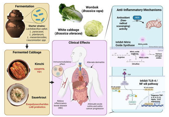 There is compelling experimental evidence that fermented vegetables or their derivatives, including preserved cabbage such as kimchi and sauerkraut, and soy-based fermented foods may potentially treat or prevent various inflammatory diseases [11]; however, clinical studies for many of these foods remain scarce. This section reviews the literature supporting the promising anti-inflammatory mechanisms of selected fermented vegetables while delineating the limitations of application in clinical medicine.
