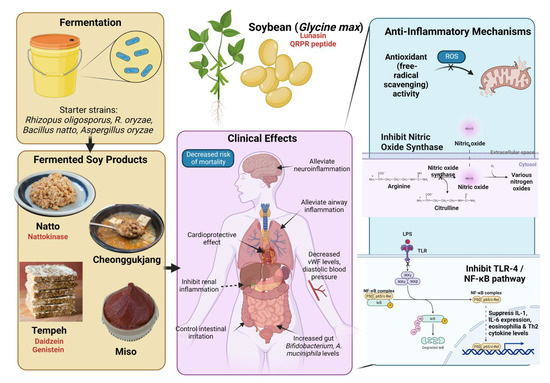 Several studies concur that fermented soy products may exert anti-inflammatory effects on various physiological systems. One such product contains nattokinase, a fibrinolytic enzyme isolated from natto, Japanese boiled soybeans fermented with Bacillus subtilis. Nattokinase (NK) is known to exhibit cardioprotective and hematological effects via its anti-inflammatory and antioxidant tendencies [130]. Jensen et al. (2019) reported in a randomized, double-blind, placebo-controlled clinical trial that 79 hypertensive subjects who consumed 100 mg NK per day for 8 weeks showed a decrease in von Willebrand factor (vWF) levels and diastolic blood pressure [131]. Research on RAW264.7 macrophages showed significant suppression of LPS-induced Toll-like receptor 4 (TLR4) and NOX-2 activation and downstream MAPK/NF-κB transcriptional pathways. Subsequently, NK-treated mice were also protected against LPS-induced acute renal trauma, concurring with cellular experiments [132]. In a massive, 15-year Japanese cohort study, natto intake was also correlated with decreased cardiovascular disease-associated deaths in adults of both genders [133].