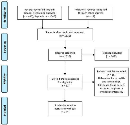 Figure 1 shows the systematic review process following the PRISMA flow diagram. In total, we found on PubMed 446 papers about HEU children; 412 studies were excluded because they refer to medical research; 34 titles were eligible and fully read, of which 10 did not satisfy the inclusion criteria, resulting in 24 studies being included. A total of 1046 studies were found through PscycInfo, of which 1031 were excluded as considered irrelevant to the topic, 15 studies were valued for eligibility, and 9 were included. Two papers were eliminated because of duplication. An extra 17 studies were added after completing the bibliography by mining and checking the work of authors expert in the field. A final number of 50 studies were used for this review, in which both qualitative and quantitative studies were included. It is important to clarify that in this review terms and acronyms are used according to specific criteria: (i) HIV-negative children born from an HIV-positive mother are defined as HEU; (ii) children living in an HIV environment, either born from an HIV-positive mother or not, have been defined HIV-affected children, even though they are not HIV-infected by definition; (iii) AIDS orphans are also considered part of the HIV-affected group, even if papers do not clearly specify whether they are HEU or HIV-infected; (iv) the category of HIV-unexposed uninfected children (HUU) corresponds to a group of HIV-negative children who were born from HIV-negative mothers and were therefore never exposed to HIV; and (v) sometimes, HEU children may fall under the category of HIV-affected children.