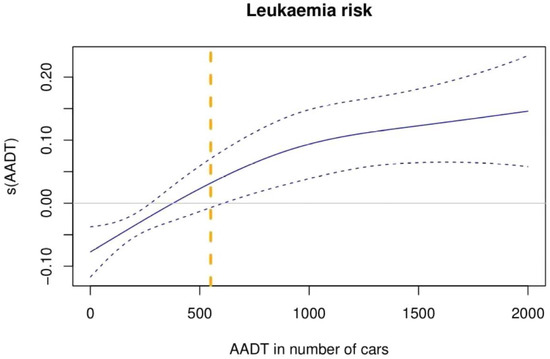 Overall childhood leukaemia exposure to traffic, measured in terms of AADT. Graphical representation of adjusted non-linear regression model for sex, year of birth, SES, and AR. s(AADT) represents AADT smooth effect on childhood leukaemia incidence. Blue dashed lines represent lower and upper 95% CI. Orange dashed line represents 550 AADT on the x-axis.
