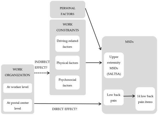 The relationships between the MSDs and the work organization were assessed based on the conceptual model (Figure 1). In this model, the relationships between MSD and work organization were of two kinds: indirect relationships corresponding to paths from a work organization factor to the outcome through individual occupational factors (physical constraints and psychosocial factors) and direct relationships corresponding to paths from a work organization factor to the outcome without passing through any occupational factors. We implemented a two-step procedure to identify which organizational factor had a direct or indirect effect on the MSDs in relation to the work constraints under study). In the first step, we selected organizational factors using a backward-selection process, adjusted for personal factors omitting work constraints, with a significance level of 0.20 indicating removal from the model. In the second step, the selected organizational factors, the work constraints, and the personal factors were included in the final model. For this model, the statistical significance of the organizational factors indicated a direct relationship with MSDs, independent of the individual occupational factors considered, while statistical insignificance indicated an indirect relationship totally mediated by the work constraints considered. In other words, the statistically insignificant factors indicated an indirect relationship to MSDs through work constraints, which were, in turn, associated with MSDs (Figure 1).
