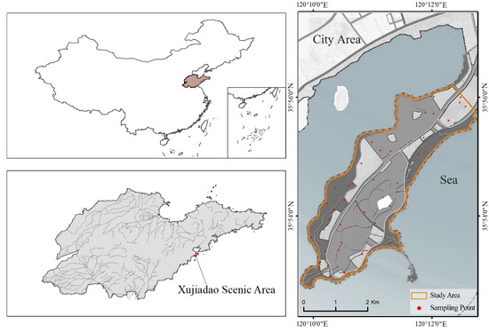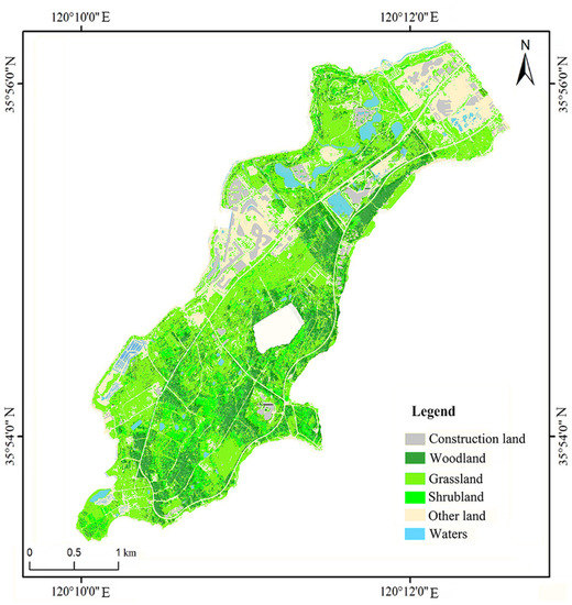 The southern part of Xuejiadao is located in the northeast of the west coast new area of Qingdao, China. Its geographic coordinate information and boundary are shown in Figure 1. The whole research area is a long and narrow peninsula surrounded by the sea on three sides extending from northeast to southwest. It is related to land in the northeast, Tangdaowan in the south, and the Yellow Sea in the east. The length of the study area from northeast to southwest is about 6.2 km, the average width is 1.6 km, and the total area is 751.02 hm. The study area belongs to a low hilly area, and the overall terrain is high in the middle and low around. The elevation is between 0 and 100 m, with a high slope in the middle. The soil is mostly brown loam, which thickens gradually from high to low with the fluctuation of the terrain. Affected by seawater intrusion, soil salinization is serious in the study area. The study area belongs to the warm temperate semihumid monsoon climate, which is directly affected by the marine monsoon, ocean currents and water masses, with moist air and abundant rainfall [41]. The average annual temperature of the study area is 12.6 °C, and the average annual precipitation is 732.1 mm, which is concentrated from June to September, and there are often torrential rains. There are no large rivers in the study area and some artificial wetlands in the northwest. The land cover types are mainly construction land, grassland, bare land, planted forest and so on. The planted forests are mostly Pinus thunbergii and Quercus acutissima, with a single structure and low understory vegetation cover.