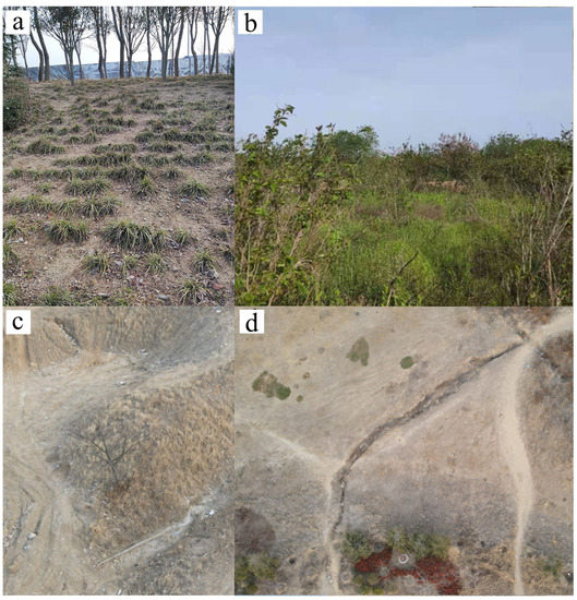 Soil erosion status in the south of Xuejiadao in 2022: (a) artificial understory grassland; (b) wild grassland; (c) abandoned landfills; and (d) wasteland erosion gully.