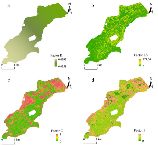 The spatial distribution of K factor (a), LS factor (b), C factor (c) and P factor (d) in the study area.