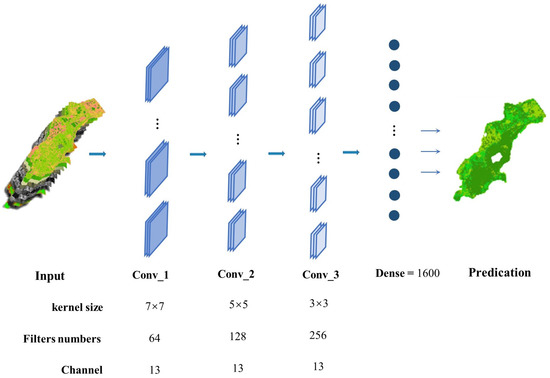 In this study, remote sensing images of UAV are resampled to obtain images with a resolution of 22,990 × 20,009. The image is then divided into an average of 432,063 pixel blocks as raw data. The pixel block size is 20 × 20. The images are marked according to the results of the fieldwork for this study. Multispectral high-resolution image features will lead to a larger CNN model, more parameters, and more difficult training. Therefore, in this study, the CNN model uses a large scale convolution operation instead of pooling layer operation. The model consists of one input layer, three convolutional layers, one fully connected layer, and one output layer. The input image size is 20 × 20, and the number of channels is 13. It is used to receive five soil erosion factors, three RGB channels and five UAV multispectral images.