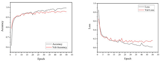 As seen from the accuracy images in Figure 6, with the increasing number of training rounds, the accuracy of the training set rises rapidly and then increases steadily, and the accuracy of the validation set stabilizes after a rapid increase and does not decrease, which indicates that the model is overfitting. In addition, it can be seen from the loss images that the training set converges quickly and then decreases steadily, the validation set converges quickly and tends to a steady state of convergence, and there is no significant increase in the loss value after decreasing during the training process, which indicates that there are no local minima in the model during the training process. After 50 iterations, the performance of the validation set was relatively stable, with essentially no change in accuracy or loss. At this point, the accuracy of the CNN test set was relatively high.