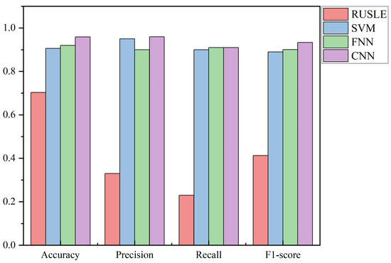 RUSLE is currently one of the most commonly used models in the field of soil erosion research and is used as a baseline for this study. SVM is a supervised machine learning algorithm for statistical classification and regression analysis [52]. SVM is currently one of the most widely used machine learning algorithms [53], and can deal with the complex and nonlinear relationships between independent variables and dependent variables [54]. FNN is the first type of simple artificial neural network invented in the field of artificial intelligence. Its structure is simple and widely used [55]. In this study, SVM, FNN, and CNN algorithms are compared to verify the accuracy and effectiveness of CNN. As can be seen from Table 3, the accuracies of the RUSLE, SVM, FNN, and CNN test sets are 70.33%, 90.63%, 92.00%, and 95.90%, respectively. Due to the random selection of sample data, the number of various samples is not balanced, and precision alone does not measure the results well. To better evaluate the classification recognition effect of each model, the recall, accuracy, and F1-score of each model (RUSLE, SVM, FNN, and CNN) for each classification are calculated, as shown in Table 3. As can be seen from Table 3, the RUSLE model has zero recall for the identification of mild and moderate erosion, and cannot accurately classify the soil erosion intensity in the study area. This is because the RUSLE model is a linear model that cannot represent the complex soil erosion relationships in ecological restoration areas. From Figure 7, the CNN model achieves the most favorable results in this study.