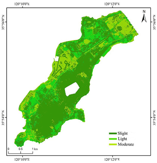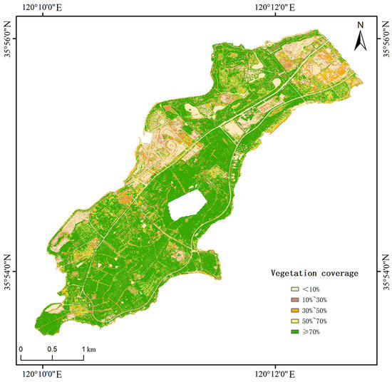 Vegetation cover is an essential index used to study soil erosion. It is very significant to analyze the change of soil erosion intensity under different vegetation covers in the study region. According to past studies, the vegetation coverage in the southern part of Xuejiadao could be divided into five levels: high coverage (≥70%), medium high coverage (50∼70%), medium coverage (30∼50%), medium low coverage (10∼30%), and low coverage (<10%) (Figure 9).