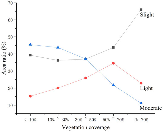 In this study, the spatial data of vegetation coverage and soil erosion intensity are superimposed. As can be seen from Figure 10 and Table 5, there is a high correlation between vegetation coverage and soil erosion intensity in the study area. The area of low coverage in the study area accounts for 16.64%, which is mainly focused in construction land, waters, and bare land. The vegetation coverage of construction land and waters is almost zero, and soil erosion hardly occurs. The vegetation coverage of bare land is low, and the rainfall directly washes the soil so that soil erosion is more serious. The intensity of soil erosion decreases as the increase of vegetation coverage in medium low coverage, medium coverage and medium high coverage. The proportion of high coverage is as high as 57.2%, and the proportion of slight erosion is 66%. This is because there is a large planted forest in the study area, and the closure degree of vegetation is high. Plant leaves and deciduous branches could effectively reduce the kinetic energy of raindrops, intercept surface runoff, increase soil infiltration, and thus reduce soil erosion. However, due to the incomplete structure of some understory vegetation, the soil and water conservation function of the vegetation community is reduced, and there are still areas of moderate erosion in the high vegetation coverage area.