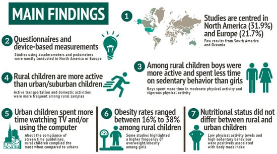 | Bell et al., 2016 [87] Australia (South Region) | 4637 9–11 years | Questionnaire | 36.7% of rural children practiced 60 min or more of PA/day and 18.8% spent more than 2 h on electronic devices, and both values were higher compared to their peers from urban areas; rural children were more likely to perform physical activity and comply with screen time recommendations than urban children; patterns of healthy lifestyle behaviours were significantly higher among rural children. | 90 | |