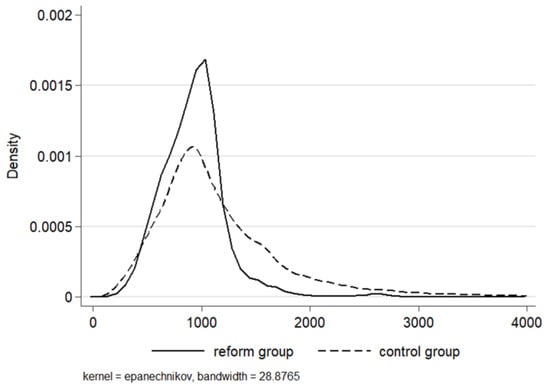 As Figure 3 shows, the distribution of patient expenditures visibly changed after the reform. Generally speaking, medical costs concentrated more densely around 1000 yuan per case and reduced at both ends. Patients discharged with the bills below 500 and over 1200 yuan decreased significantly in the reform group. The distribution variation implied that heterogeneous effects may exist.