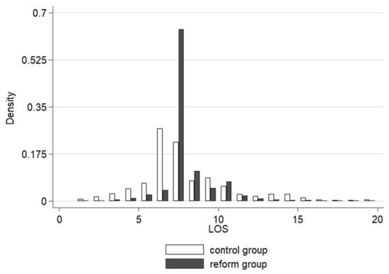 Distribution of the LOS in the control and reform groups. To clearly display the density, a 95% winsorization of the high ends was processed.