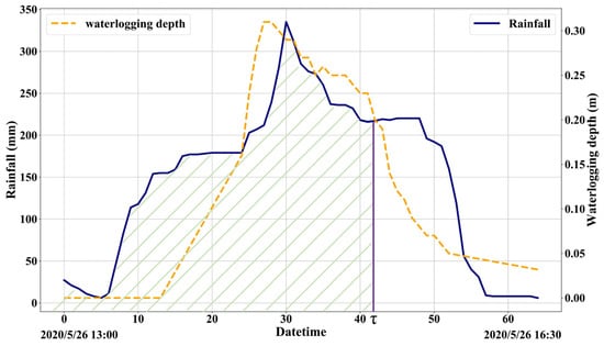 Rainfall process curve and depth of waterlogging (green diagonal part is the cumulative rainfall).