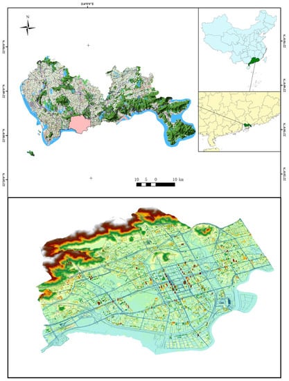 This paper takes Futian District, Shenzhen, China, as the research object. Shenzhen, a global megacity, is one of the core cities in the Guangdong-Hong Kong-Macao Greater Bay Area (Figure 4). The population density is 8791 people per square kilometer, ranking first in China. The overall road density in the urban area is 9.50 km/km2, ranking first among 36 major cities in China. The higher population density and road density increases the risk of the city when facing the occurrence of waterlogging. Futian District is the central urban area of Shenzhen with a high level of development and economic density. With a resident population of over 1.66 million in 2021, its GDP accounts for 16.9% (454.6 billion yuan) of the city’s GDP (269.27 billion yuan), although its area only accounts for 4% of the city’s total area. Futian District has a total area of 78.6 square kilometers, and its topography is mainly plains, hills, mountains, and beaches, with mountains in the north and the sea in the south, and the terrain is high in the north and low in the south. Futian District is located south of the Tropic of Cancer and has a subtropical maritime climate with abundant rainfall, and an average annual precipitation of 1866 mm [36]. The rainfall is primarily concentrated from June to August, with August being typhoon season, with typhoon rainstorms and other extreme weather prone to flooding.