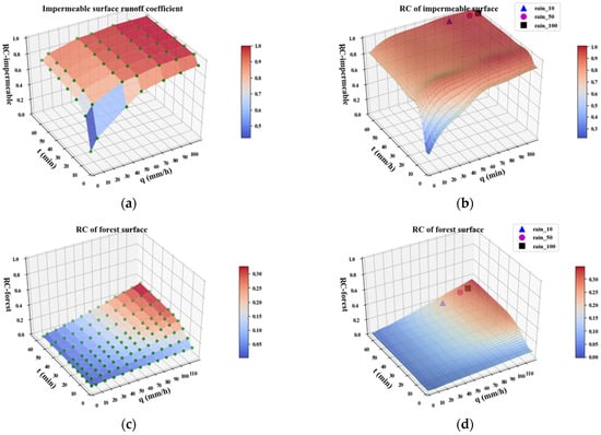 - The runoff coefficient is an important parameter for calculating the surface runoff, which is mainly determined by the land cover type, but is also influenced by the rainfall intensity, rainfall ephemeris, season, and surface water content [48]. In practice, the runoff coefficients are supposed to be time-varying variables influenced by multiple factors. In this study, the time-varying runoff coefficients of impervious surfaces, woodlands, grasslands, and bare soils were fitted for different rainfall inputs and seasonal factor scenarios using experimental results from other studies. The surface runoff coefficients can be quickly obtained using the runoff coefficient fitting function (Figure 6).