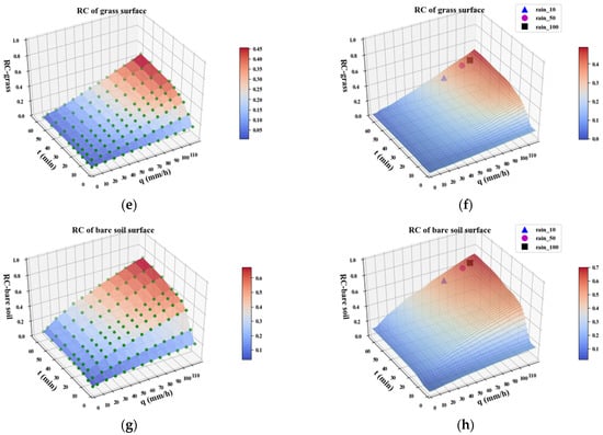 The construction land in Futian District is 5909 hectares, accounting for 74.9% of the total land area. Most of the construction land has asphalt, concrete, and cement surfaces, which have larger runoff coefficients; while woodlands, grassland, wetland, and bare soil have smaller runoff coefficients and a stronger ability to accumulate rainfall. According to the data on surface cover types, we get the range of base runoff coefficients for each material terrain [40] and use the runoff coefficients of woodland and grassland to simulate the experimental results [41,42]. As shown in (a) to (h) of Figure 6, the green dots are experimental data, varying with the rainfall intensity and rainfall ephemeris. The fitted runoff coefficients based on each surface cover type for a given rainfall intensity and ephemeral conditions were obtained by two-dimensional interpolation fitting.