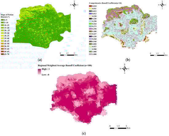 Slope distribution in Futian District (a), integrated runoff coefficient of each grid (b), weighted average runoff coefficients for each sub-catchment in Futian District (c).