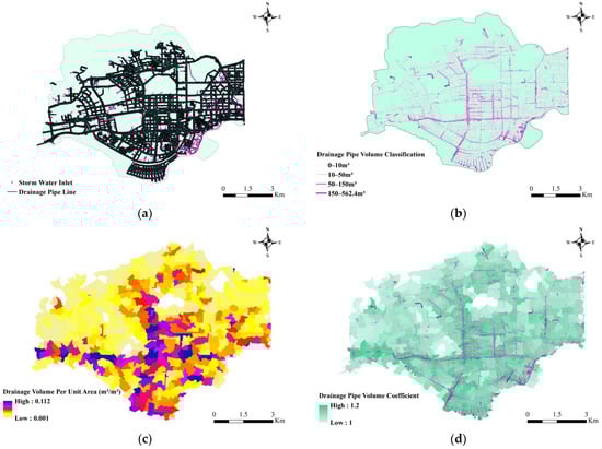 Distribution of drainage system and calculation results of drainage capacity in Futian District. (a) Rainwater grate and drainage pipe distribution. (b) Drainage pipe volume classification. (c) Drainage volume per unit area (m3/m2). (d) Drainage pipe volume coefficient.