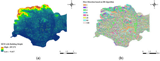 (a) DEM of superimposed building heights in Futian District; (b) Flow direction values of each grid in Futian District.