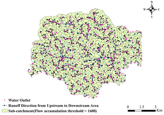 Based on the DEM of the superimposed building height in Figure 9a, the flow direction values of each grid are calculated using the D8 single flow direction algorithm to obtain the flow direction results in Figure 9b. From the flow direction results of each grid, the cumulative value of flow is calculated. After several trials, we defined the catchment area threshold AC in Futian District that can generate the surface runoff as 40,000 m2. The reason is that the topography of Futian District is mostly flat, and most of the mountains are concentrated in the northern region, where the runoff flow kinetic energy is small. When it is smaller than AC, it is difficult for the area to form large-scale waterlogging in reality. A catchment area of 40,000 m2 corresponds to a cumulative flow value of 1600. In total, 596 sub-catchments are shown in Figure 10 after calculation and correction.