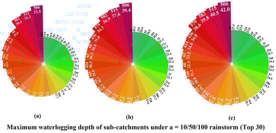 Top 30 sub-catchments with maximum ponding depth values (cm) under the three rainfall models. (a): a = 10; (b): a = 50; (c): a = 100.