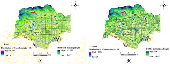 As can be seen from the waterlogging distribution maps in Figure 14, the urban inundation is usually concentrated in low-lying areas. For mountainous areas, the steep terrain makes the runoff coefficient larger than that of the flat areas. The drainage facilities in the mountainous areas are not well developed and correspond to insufficient drainage capacity. A large amount of rainfall that is not absorbed by the ground is converted into the surface runoff that moves down the slopes and collects in the low-lying areas at the foot of the mountains. In contrast, the urban built-up areas have relatively good drainage facilities, and the accumulated rainfall can usually be discharged into the underground drainage network in a timely manner, so these areas are not prone to waterlogging. However, there are some urban areas where the drainage capacity is insufficient to meet the needs of waterlogging prevention and drainage. In response to the above results, urban municipalities should strengthen the construction of drainage network facilities in the waterlogging areas, especially in the flooded areas adjacent to hills, such as by changing the drainage pipes to larger diameters and increasing the above-ground rainwater outfalls. This can enhance the ability to resist the occurrence of waterlogging when hit by typhoon and rainstorm disasters. For areas where it is difficult to change the structure of the drainage network, it is recommended to improve the waterlogging disaster plan, such as by deploying emergency drainage teams in advance to carry out emergency drainage operations on the roads, communities, and facilities with serious waterlogging, so as to reduce the impact of waterlogging disasters. Some roads with deep water may also face problems such as poor drainage (low terrain is prone to overflow), and the depth in reality may be higher than the simulation value. In extreme rainstorm scenarios, a broken vehicle trapped in standing water will be at risk of being gradually submerged over time [46]. The occupants of the vehicle need to escape in time.