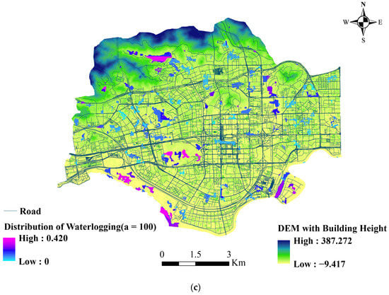 Waterlogging distribution under three rainfall input models. (a) a = 10; (b) a = 50; (c) a = 100.