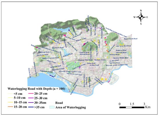 Waterlogging roads with different depth in a = 100 rainstorm scenario.