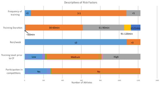 - Teixeira, R.V.; Dantas, M.; Motas, D.G.D.; Gantois, P.; Aidar, F.J.; Dantas, P.M.S.; Queiros, V.S.D.; Cesário, T.D.M.; De Araújo Tinôco Cabral, B.G. Retrospective Study of Risk Factors and the Prevalence of Injuries in HIFT. Int. J. Sports Med. 2020, 41, 168–174. [Google Scholar] [CrossRef] [PubMed]