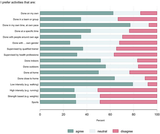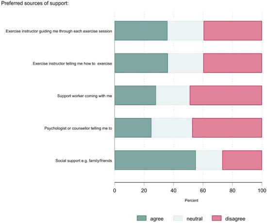 Figure 1 and Figure 2 show the physical activity preferences of the group as a whole. More than 60% of the participants stated that they preferred activities that could be accomplished on their own, at their own time and pace, and close to home. The most preferred physical activity type was low intensity activities, such as walking (76%). Approximately one-half of the participants disagreed with the statements about sports and high-intensity and strength-based activities. The most preferred source of support for physical activity was social support from family and friends (54%). The least preferred sources of support were a support worker or psychologist/counsellor. The most preferred time to do physical activity was 11 a.m.–2 p.m. (40%), whereas the least preferred was before 8 a.m. (10%).