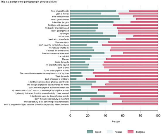 Figure 3 shows the physical activity barriers data for the group as a whole. The most commonly cited barriers were poor physical and mental health (50% and 54%, respectively), lack of motivation (55%), and being too tired (50%). Those ≥60% disagreed that the following were barriers: not having the right clothes/shoes (61%); fear of injury (60%); the mental health service taking up too much of their time (71%); work demands (68%); lack of access to childcare (77%); thinking that physical activity will not benefit them (65%) or is unimportant (64%).