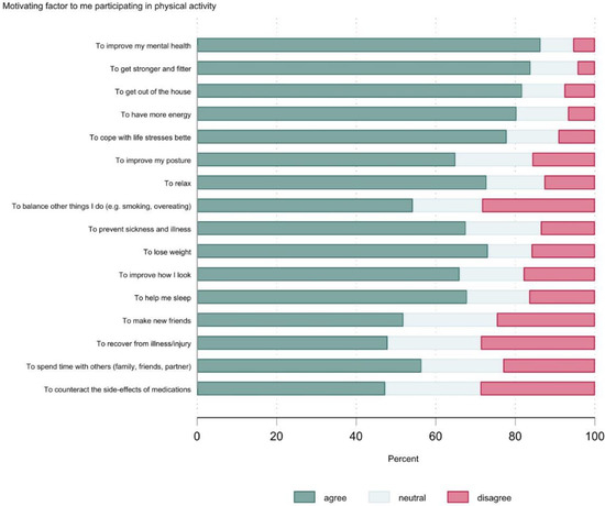 Figure 4 shows the motivating factors data for the group as a whole. Eleven factors had a rate of agreement ≥60%, with the five highest ranking factors being ‘to improve my mental health’ (84%), ‘to get stronger and fitter’ (81%), ‘to get out of the house’ (79%), ‘to have more energy’ (77%), and ‘to cope with life stressors better’ (74%).