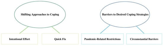 Thematic Map. Note. The final thematic map displays two major themes and their corresponding subthemes. The first theme is Shifting Approaches to Coping, with subthemes Intentional Effort and Quick Fix. The second theme is Barriers to Desired Coping Strategies, with subthemes Pandemic-Related Restrictions and Circumstantial Barriers.