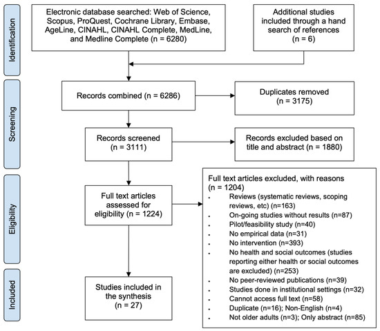 Through the full-text review, 27 publications that met the inclusion/exclusion criteria were selected. We extracted the findings from each study and summarized the scope of the existing research on age-friendly community interventions. In the results below, we first describe the characteristics of the studies by synthesizing their findings based on the different intervention types.