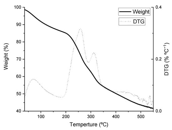 Figure 5 depicts the curves obtained when the sample underwent heat treatments between 35 and 550 °C. The differential curve (DTG) shows a first peak of heat absorption at around 95 °C, corresponding to water evaporation, with no pyrolysis at this stage [39]. The exothermic effect generally appears when the temperature rises above 190 °C, largely due to the breakdown of proteins, soluble polysaccharides, and organic matter [40].
