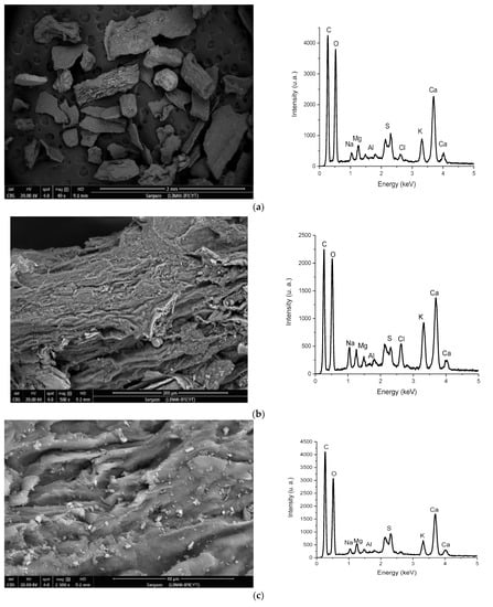 The concentration of minor elements (a) and major elements (b) is shown in Figure 3. Sargassum had high concentrations of sodium, magnesium, and potassium, typical of materials that develop in a saline environment, with cell walls and constituent polymers that are capable of accumulating these elements [24].