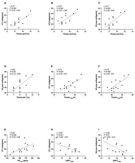Therefore, the objective of the present investigation was to investigate the relationship between the VO2max, VT1, and VT2 with the SWFT variables (HRfinal, HR1min, HRsum, throws, and SWFTindex). Based on previous studies [9,10], we hypothesize that the VO2max, VT1, and VT2 will correlate significantly with SWFT variables.
