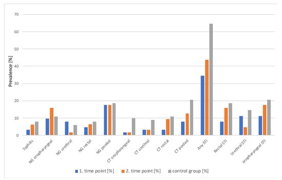 - Jansen, K.; Steffen, G.; Potthoff, A.; Schuppe, A.K.; Beer, D.; Jessen, H.; Scholten, S.; Spornraft-Ragaller, P.; Bremer, V.; Tiemann, C. STI in times of PrEP: High prevalence of chlamydia, gonorrhea, and mycoplasma at different anatomic sites in men who have sex with men in Germany. BMC Infect. Dis. 2020, 20, 110. [Google Scholar] [CrossRef]