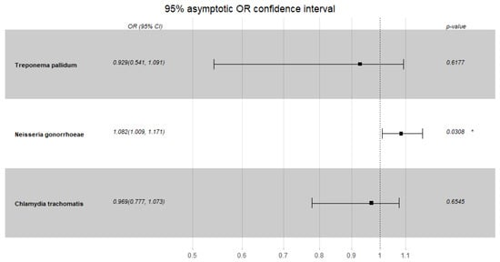 Neisseria gonorrhoeae, Chlamydia trachomatis and Treponema pallidum risk of infection in the studied group dependent on the number of sexual partners—first timepoint. * p < 0.05.