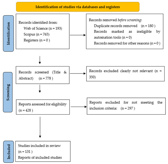 The search was carried out in September 2022. A total of 193 documents were found in WoS and 765 documents in Scopus. Subsequently, the RefWorks® bibliographic manager was used and duplicate articles were eliminated, leaving a total of 778 articles. After applying the filter of scientific articles, the inclusion and exclusion criteria recorded in Table 1, and the relevance of the works for this rapid review, a total of 131 scientific articles were selected. From these studies, the most relevant information that was of interest to this work, as determined by the opinions of the researchers participating in the search, was selected. The most important aspects of the development of each approach, its main goals, and its configuring elements were highlighted. Articles confirming the positive effects of each approach on some variables of the teaching–learning process were also selected, giving priority to systematic review, meta-analysis, or literature review articles. In cases where there was little information on a pedagogical approach, the authors of said models were personally contacted through institutional emails to delve into more bibliographic sources.