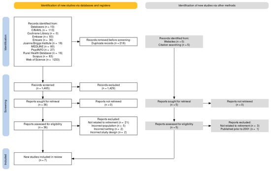 The study selection process is presented in Figure 1. A total of 1698 studies were identified from the initial database and the grey literature search. Duplicates (n = 218) were then removed, and the remaining 1470 studies were screened via their title and abstract. Full texts were retrieved for 41 studies and assessed thoroughly against the eligibility criteria. Studies were excluded for the following reasons: they were not related to retirement (e.g., focused on health, wellbeing, or age-related issues more broadly or focused on financial or business-related aspects of farming); they were focused on an ineligible population (e.g., non-farming rural population or farmers planning to leave farming for reasons other than retirement); they were based in an ineligible setting (e.g., research conducted outside of Australia); they used an ineligible study design (e.g., narrative review); or they were published prior to 2001. Seven studies were identified and included in the review.