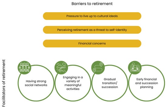 Significant overlap was observed between the sources of retirement-related stress and barriers to retirement, reported by farmers. For example, Foskey [41] described farmers perceiving retirement as an end to life and purpose, stemming from the intertwined relationships between home, occupation, identity and place. This contributed to farmers’ stress around retirement and planning for retirement, while also posing a barrier to them actually doing it. Similarly, farmers described feeling a sense of redundancy and identity loss when their valued interests and activities and relationships related to the farm were not well maintained through their transition to retirement [40]. Farmers preparing for retirement described a fear of not feeling valued or needed in their community [34]; a similar sentiment of not having anything meaningful to contribute beyond farming, was described by farmers who had fully retired [10]. Several studies [7,10,15,34] also described poor health and diminishing capacity to get work done as a key driver of stress around retirement. Poor health and diminishing capacity were the only sources of stress that did not also act as barriers to retirement. Other drivers of stress (e.g., fear of redundancy, fear of identity loss, financial concerns, having to sell the farm and lack of successor) were reflected in barriers to retirement identified, as detailed in Table 2.