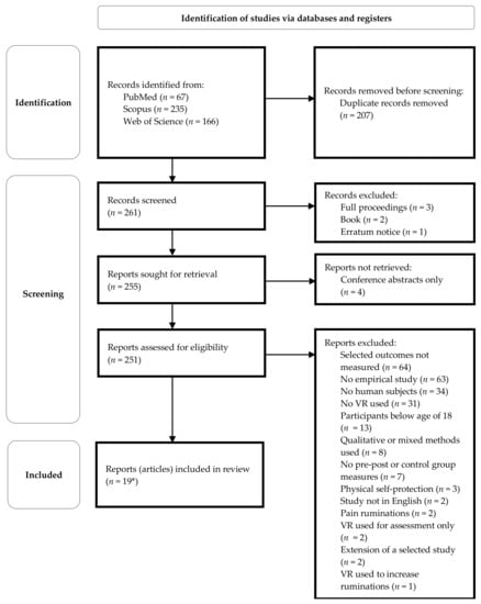 The most common reasons for reports not to be selected for this review were: selected variables not measured; no empirical study; no human subjects involved; VR not used; participants below the age of 18; and no pre/post and/or control group intervention measures of selected outcomes. For details, see the PRISMA flow diagram in Figure 1.