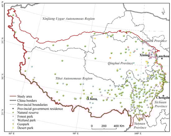 The Qinghai–Tibet Plateau involves six Chinese provinces: Tibet Autonomous Region, Xinjiang Uygur Autonomous Region, Qinghai Province, Gansu Province, Sichuan Province, and Yunnan Province (Figure 1). There are five main types of natural protected areas, including nature reserves, forest parks, wetland parks, geoparks, and desert parks. Among them, there are 174 nature reserves. The total human population in these natural protected areas is 1.41 million people, and the population density is 1.6 people/km2.