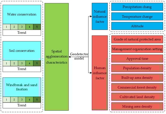 The factors influencingthe protection effectiveness of the natural protected areas on the Qinghai–Tibet Plateau involve categorical variables (such as the grade of natural protected areas and management organization settings). Since the linear regression method is limited to discontinuous variables and is unsuitable for solving theseproblems, the Geodetector model [] was used to study the driving mechanism of the influencing factors.