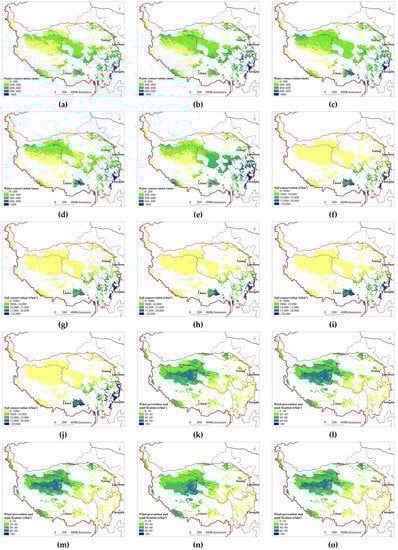 Temporal and spatial changes in the ecosystem services of the natural protected areas on the Qinghai–Tibet Plateau; (a)—water conservation in 2000; (b)—water conservation in 2005; (c)—water conservation in 2010; (d)—water conservation in 2015; (e)—water conservation in 2020; (f)—soil conservationin 2000; (g)—soil conservation in 2005; (h)—soil conservation in 2010; (i)—soil conservation in 2015; (j)—soil conservation in 2020; (k)—wind prevention and sand fixationin 2000; (l)—wind prevention and sand fixation in 2005; (m)—wind prevention and sand fixation in 2010; (n)—wind prevention and sand fixation in 2015; (o)—wind prevention and sand fixation in 2020.