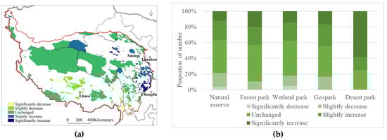 There were 53 natural protected areas with significant increases in the water conservation function, mainly in Qinghai and Sichuan Provinces. There were 10 natural protected areas with significant declines, mainly in the Tibet Autonomous Region and Yunnan Province. There were 48, 140, and 79 cases with slight decreases, no changes, and slight increases, respectively, accounting for 14.55%, 42.42%, and 23.94%, respectively, of the total number of natural protected areas (Figure 4a). The water conservation function of nature reserves, forest parks, wetland parks, and geoparks remainedunchanged. The water conservation function of desert parks significantly increased, accounting for 58.33% of the total number of desert parks (Figure 4b).
