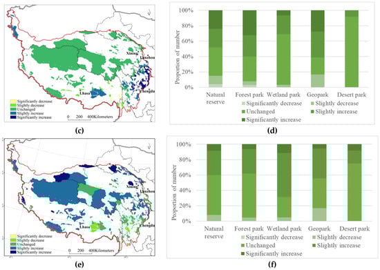 There were 28 natural protected areas with a significantly increased windbreak and sand fixation function, mainly in the Tibet Autonomous Region. There were 23, 159, and 120 cases with slight decreases, no changes, and slight increases, respectively, accounting for 6.97%, 48.18%, and 36.36%, respectively, of the total number of protected areas. No significant reduction occurred (Figure 4e). The windbreak and sand fixation function of nature reserves, forest parks, and desert parks remained  unchanged. Wetland parks were dominated by slight increases, and that of geoparks remained largely unchanged or slightly increased (Figure 4f).