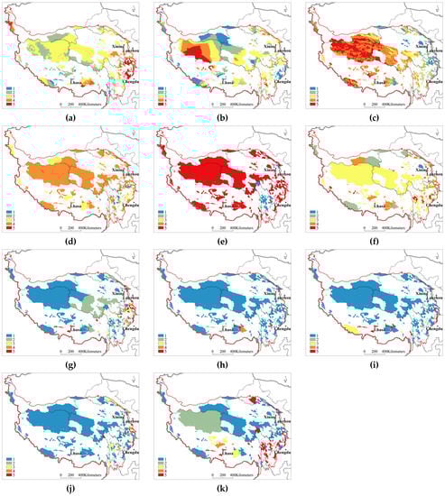 Spatial distribution of the influencing factors of the protection effectiveness of the natural protected areas on the Qinghai–Tibet Plateau. (a) Precipitation (b) Temperature (c) Altitude (d) Grade of natural protected area (e) Management organization (f) Approval time (g) Population density (h) Built-up area density (i) Commercial forest (j) Cultivated land density (k) Mining area density.